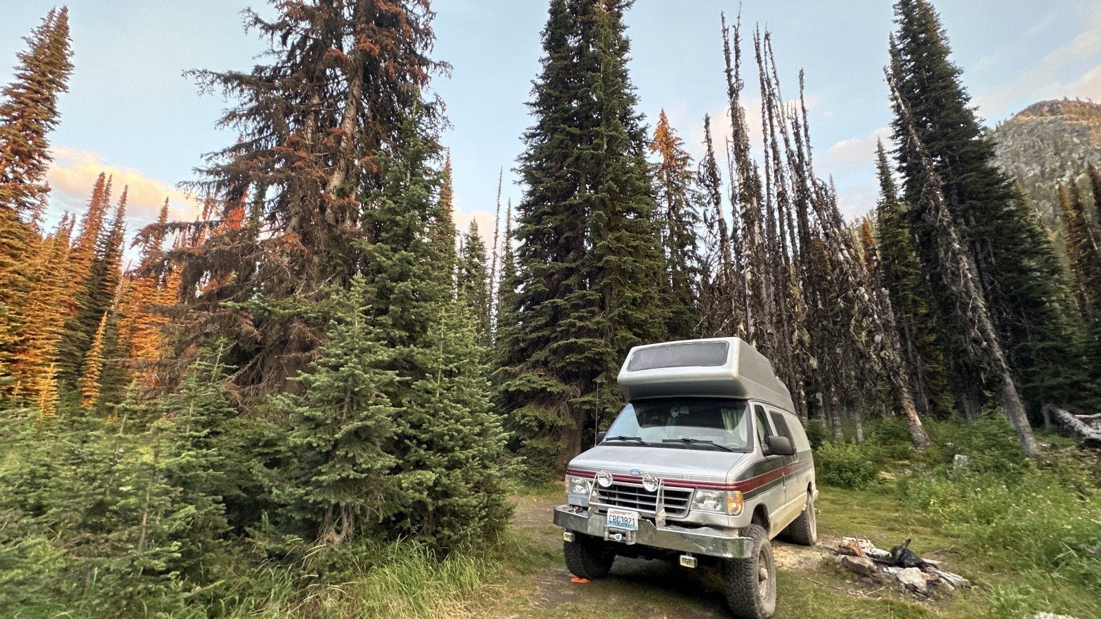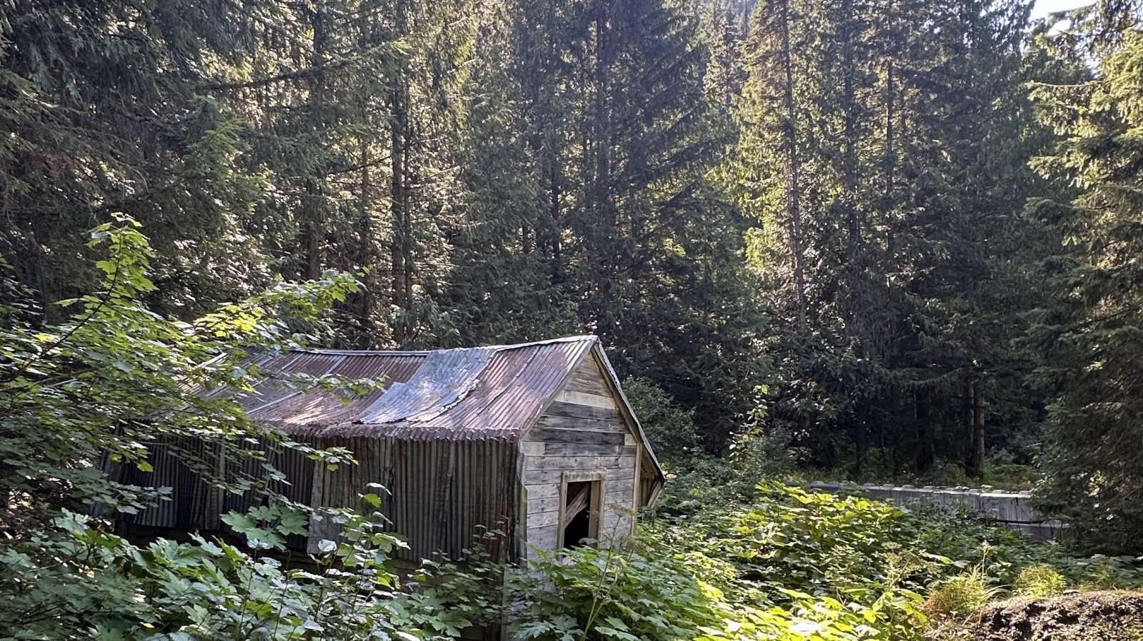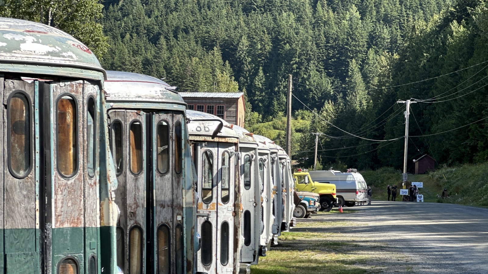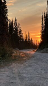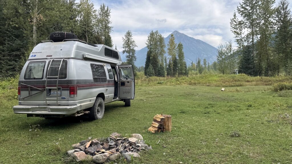We aimed for the nearby campground, but it was full. No worries. Sandon turned out to be surprisingly lively for a “ghost town” — multiple museums, restored buildings, and even a snack shack. (Ice cream cone = instant win.) But for the real haunted vibes, we bumped farther down a rough dirt road to Cody. That was the real deal: a handful of crumbling structures, barely standing, ghosts practically sighing through the timbers. We poked around, soaked in the desolation, and then faced the real challenge: finding a camp spot. Tight canyon, private property everywhere — strike after strike. By late afternoon we caved and pulled Marcel back out to the highway and to a lakeside turnout at the top of the pass. Roadside camping isn’t our jam, but when the clock says 4 p.m., you do what you gotta do.