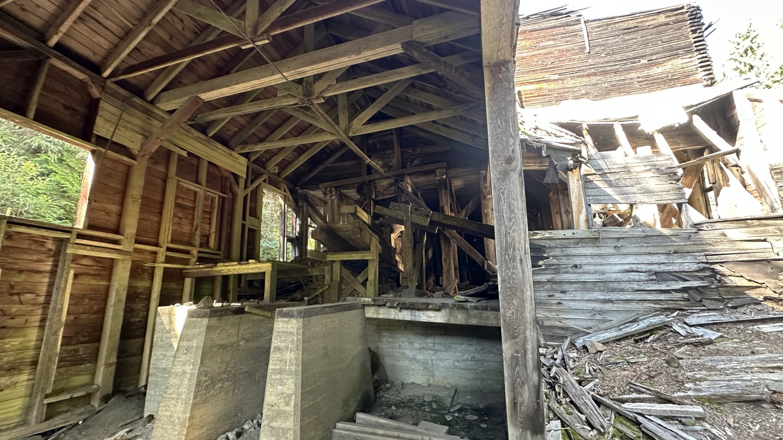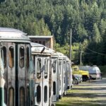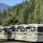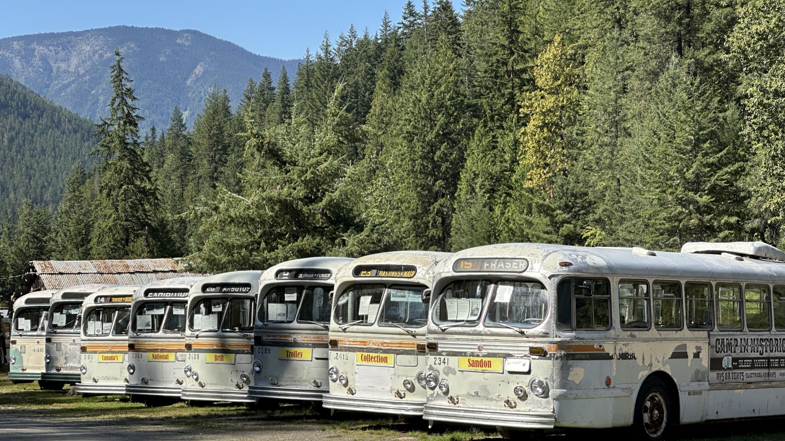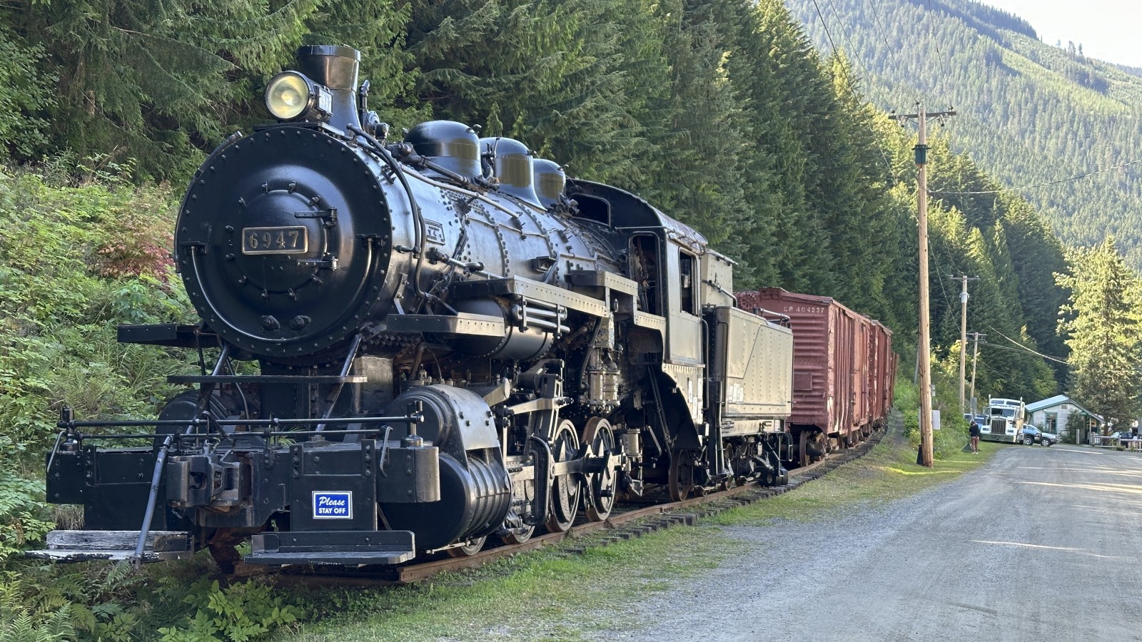 We aimed for the nearby campground, but it was full. No worries. Sandon turned out to be surprisingly lively for a “ghost town” — multiple museums, restored buildings, and even a snack shack. (Ice cream cone = instant win.) But for the real haunted vibes, we bumped farther down a rough dirt road to Cody. That was the real deal: a handful of crumbling structures, barely standing, ghosts practically sighing through the timbers. We poked around, soaked in the desolation, and then faced the real challenge: finding a camp spot. Tight canyon, private property everywhere — strike after strike. By late afternoon we caved and pulled Marcel back out to the highway and to a lakeside turnout at the top of the pass. Roadside camping isn’t our jam, but when the clock says 4 p.m., you do what you gotta do.