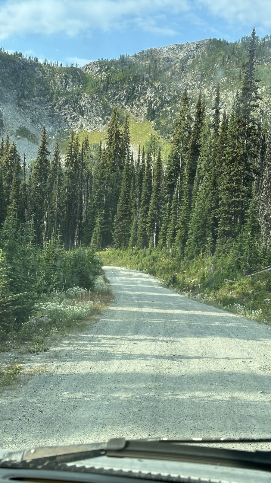 Next stop: Kaslo for supplies, then south to Balfour to hop another of BC’s free ferries. This one was the longest ferry ride in the province — 45 minutes across Kootenay Lake. From there, another dirt road lured me in. This wasn’t your average canyon crawler either — it went over a mountain pass. Eighty kilometers of dirt. Seventeen kilometers of 9% grade. A 4,000-foot climb. For a five-ton van that had to meet California’s 1995 smog standards. What could go wrong?