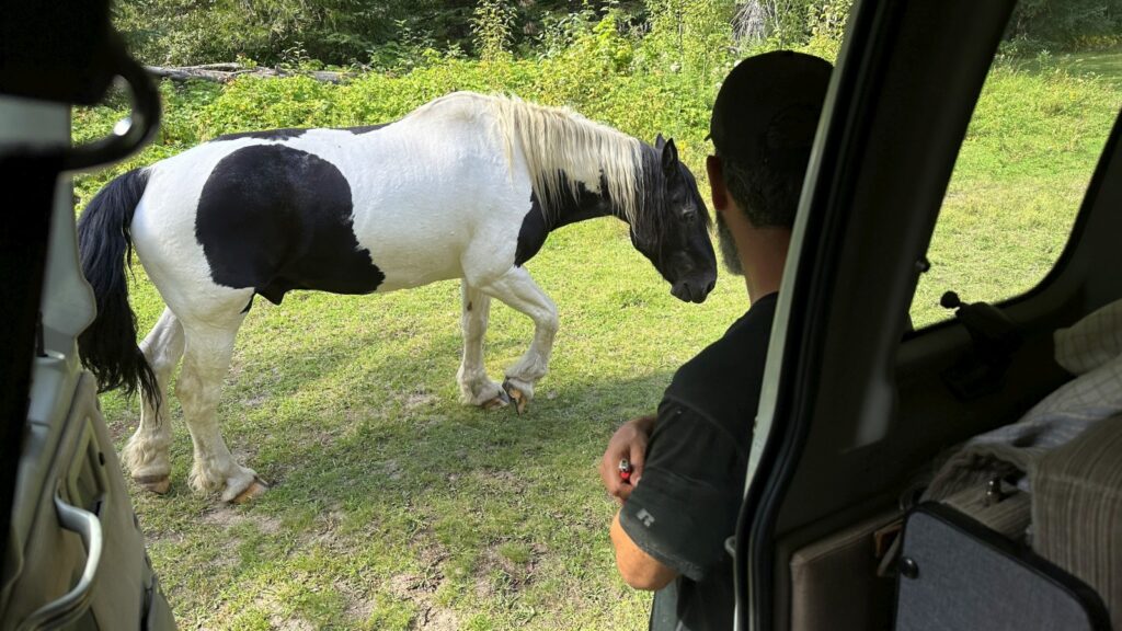 That’s when the magic happened: a family of wild horses wandered in and loitered like they owned the place – obviously, they did. They didn’t do much besides hang out, but it was surreal watching them graze in front of Marcel for hours. Eventually they meandered off, and we had the forest back.