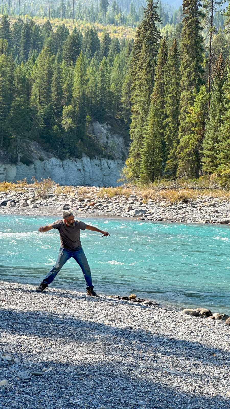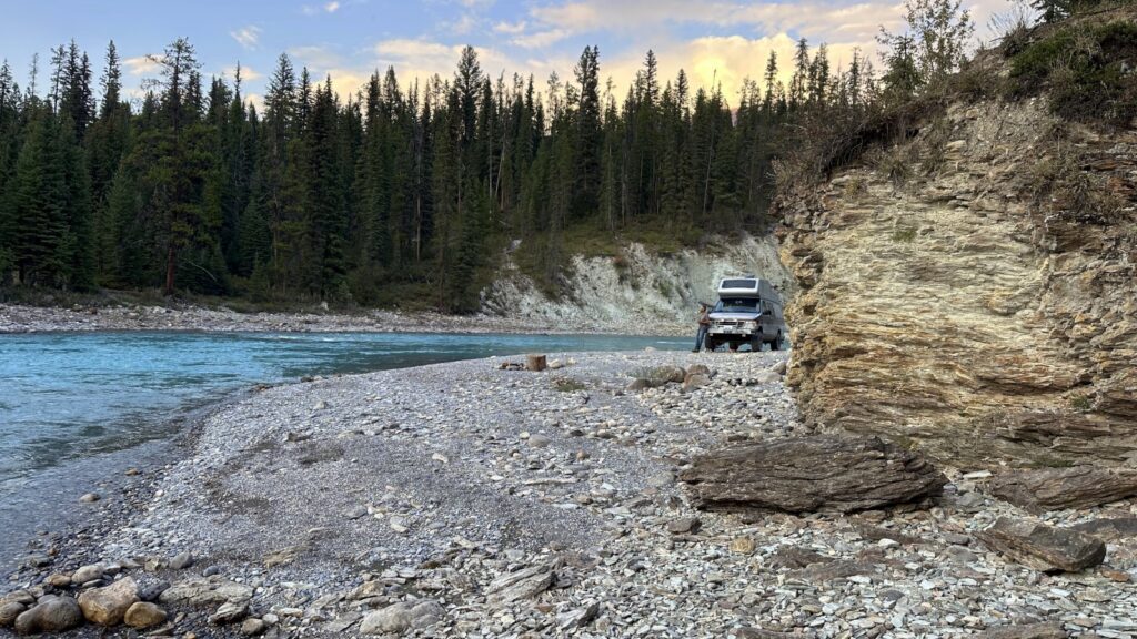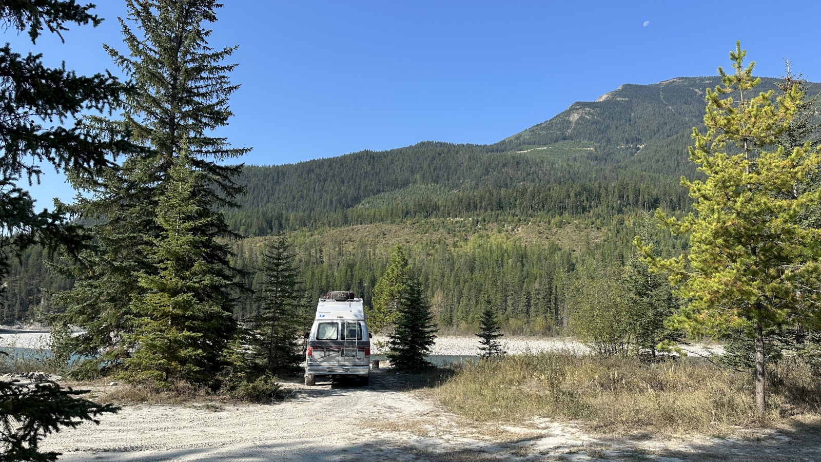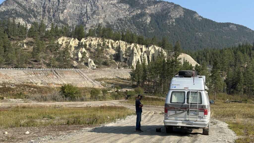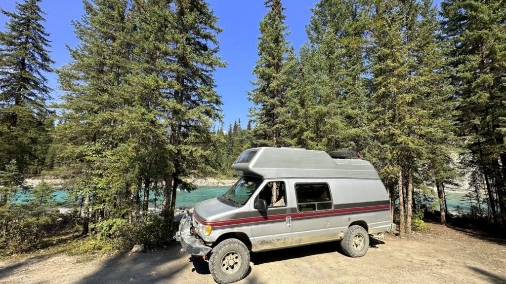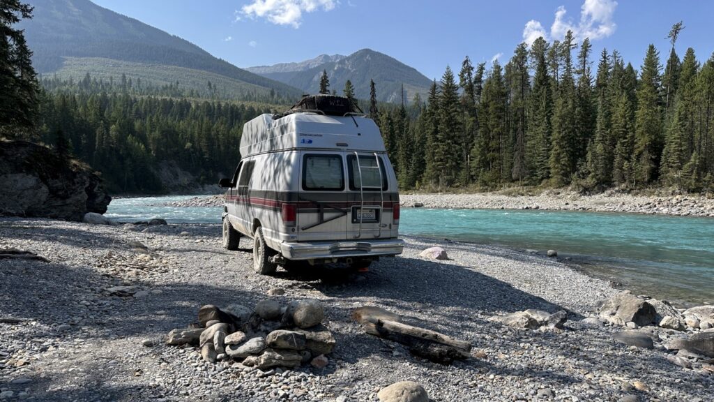 When we finally pried ourselves away from Horseshoe Rapids, we still weren’t ready for pavement. One last stop caught our eye — Kootenay–White Rivers Junction Recreation Area, where the two rivers meet in a swirl of teal and white. Not quite as jaw-dropping as Horseshoe, but still pretty spectacular. We shared the wide-open area with one other van, though neither of us made the trek to say hello. Sometimes the best neighbors are the ones you never meet.