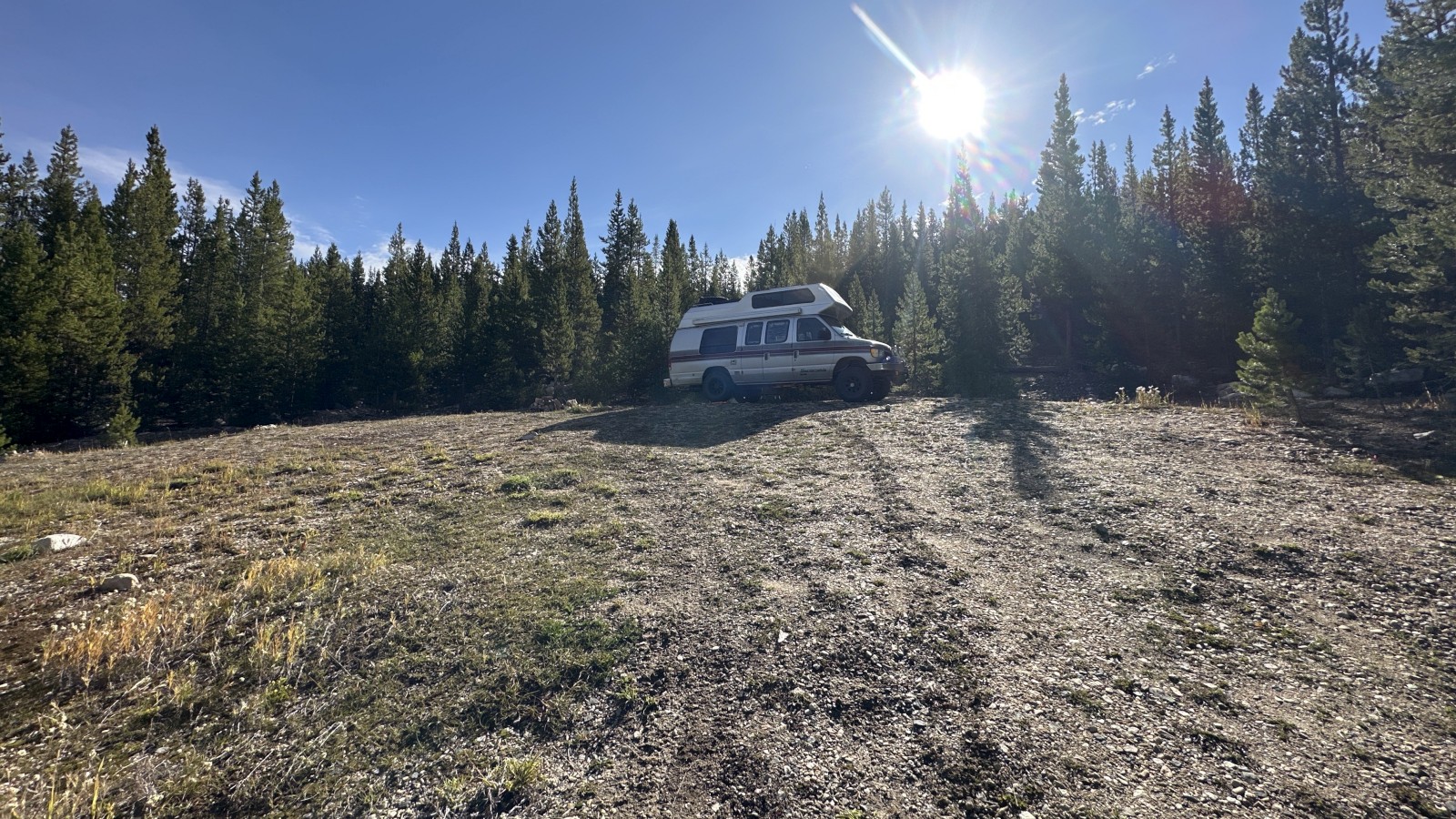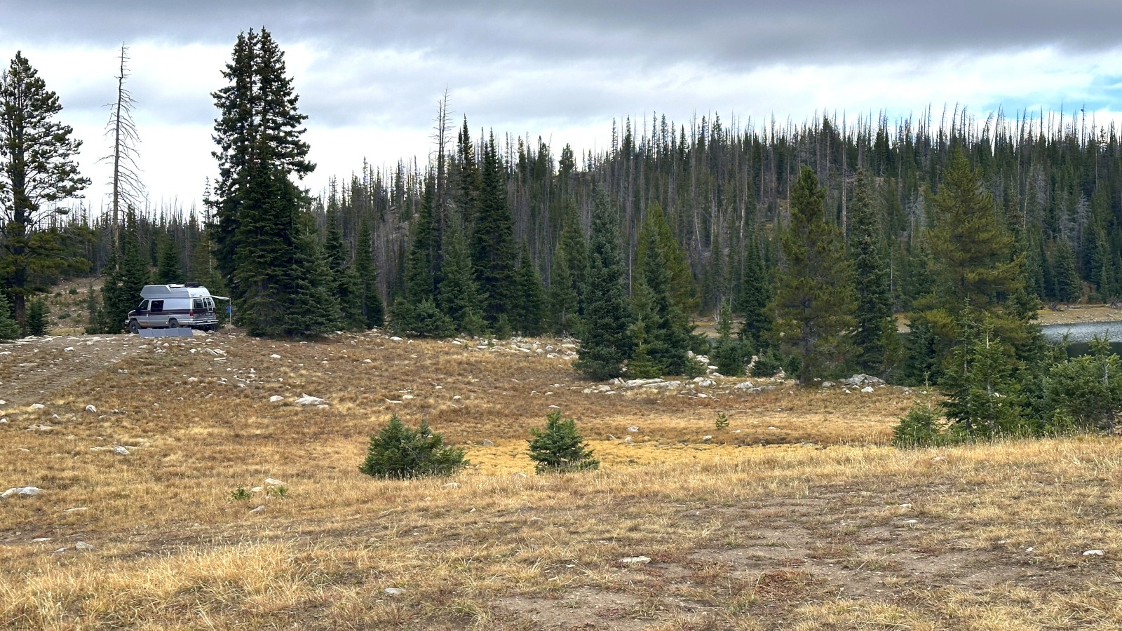 Heading south again, we veered off onto a highway leading into the Snowy Range, then onto a dirt road into the forest. The first stretch was already full of campers, so we kept going until we found a small clearing just big enough for Marcel and a faint Starlink signal sneaking through the trees. The spot wasn’t level, but daylight was fading, so we called it home for the night.