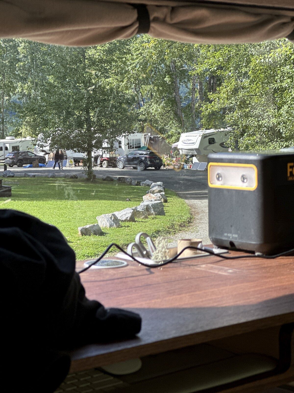 Here’s the thing about van travel: an hour of driving for a normal human equals an all-day ordeal for us. We stop, we scout, we rubber-neck. Progress is measured in “looks promising” detours, not miles. After a few hours of that routine, my patience had run dry. We still hadn’t found a place to crash, and my crankiness was setting new records. Finally — salvation. Another recreation site, and yes, it was paid camping again. Normally that’s a hard no, but the sites were right on the water. Decision made. Victory achieved.