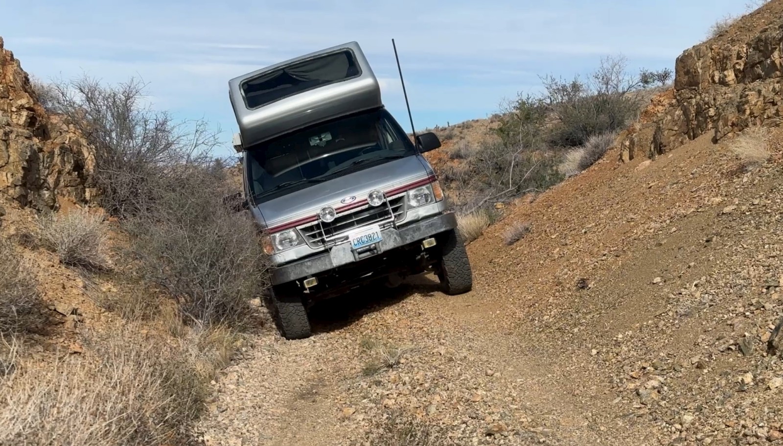 This was a first for us. Luckily, it didn’t require a winch, a tow strap, or any sort of drama—just all four of our hands and a bit of stubbornness. Tree relocated, we carried on. Not much farther along, cruising atop an old railroad bed, the road simply vanished into a ravine. Not a huge one—but easily big enough to swallow Marcel whole. We backed up, detoured through the wash below, and continued on, leaving that particular disaster scenario unexplored.