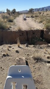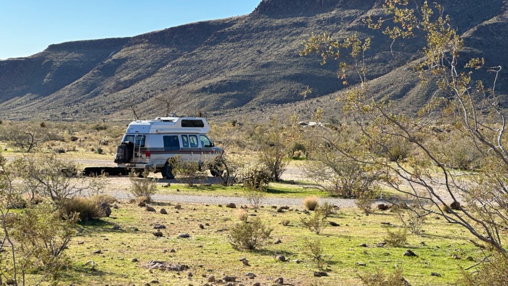 We completed the loop by heading back to Hole-in-the-Wall Campground to top off water, then bounced north again on the washboard road. I’d wanted to visit this campground since we missed it on our first Mojave trip. As soon as we pulled in, it clicked—we had been here before. This was the same campground where Big Blue once became a travel trailer. Memory unlocked.
