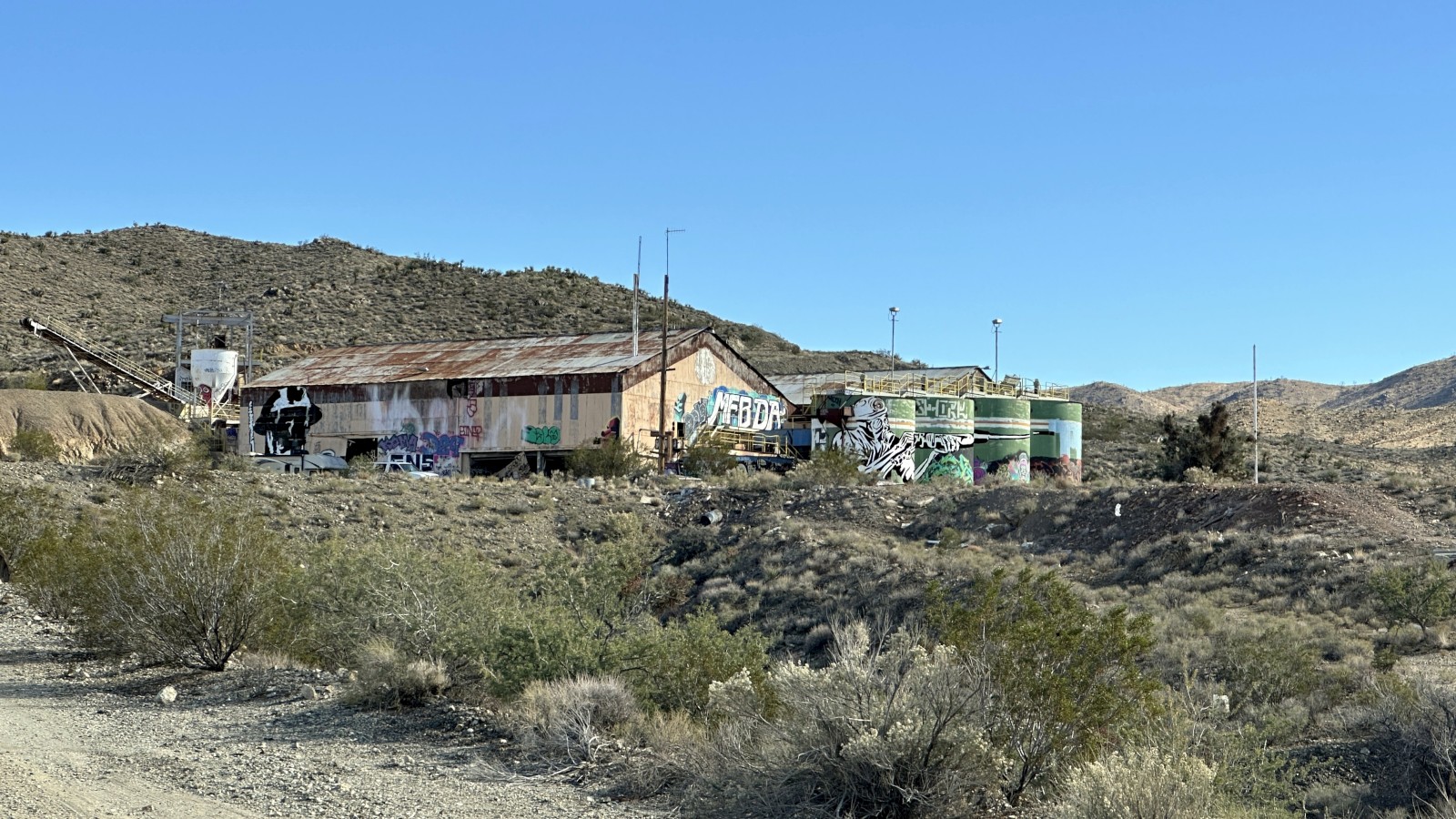 Our goal that evening was the ghost town of Vanderbilt, but the desert had other plans. Another washed-out road stopped us about a mile short of town, forcing us to settle for a fairly uninspiring hillside camp overlooking the Interstate and the glowing towers of the Ivanpah Solar Electric Generating System. The towers burned bright well into the evening, finally dimming as the sun dropped low. Not exactly wilderness immersion, but it worked.