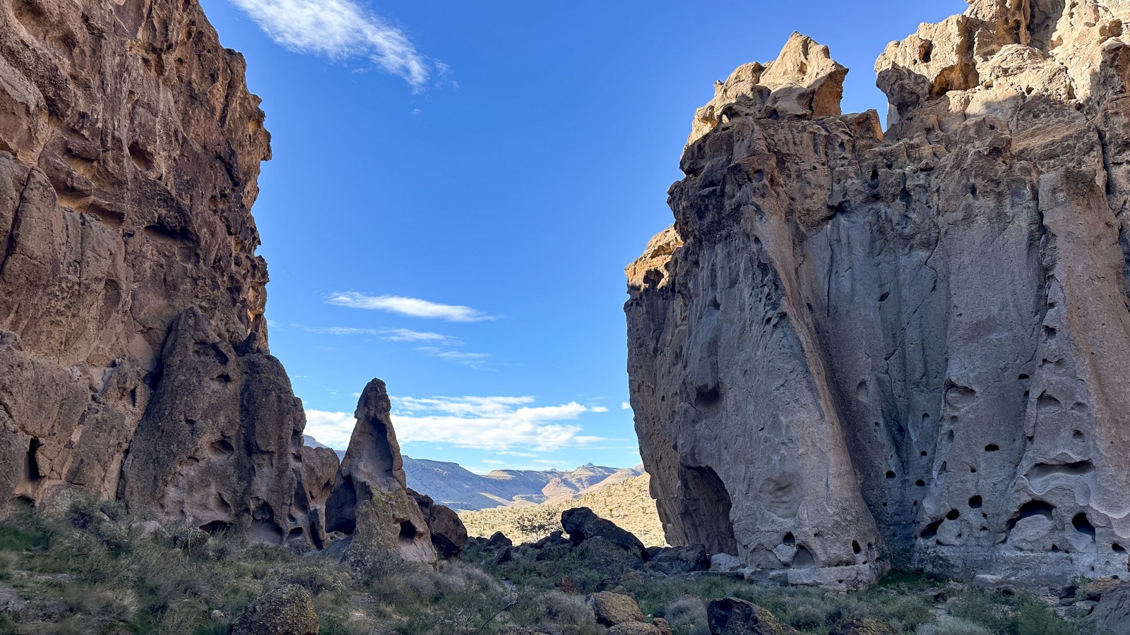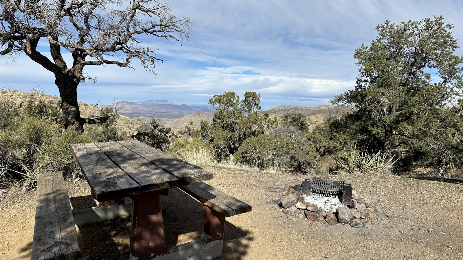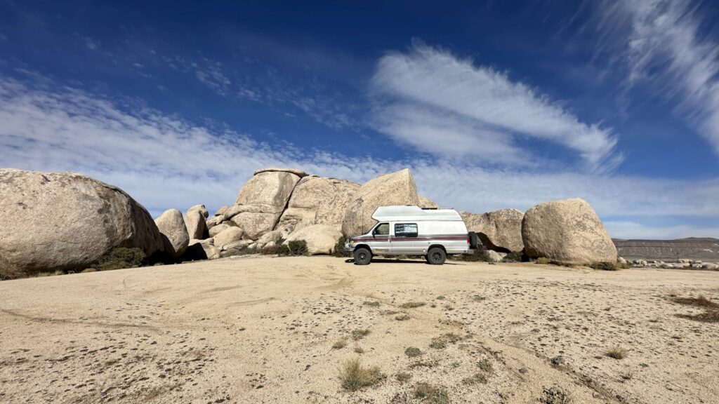 We reached Mid Hills Campground at the top, but since it required a fee and we were surrounded by free public land, we kept going. The Wild Horse Loop caught our attention next, complete with a sign warning high clearance and 4WD only. Marcel qualifies on both counts. The road was rough in spots, but far better than the washboard we’d just endured. Eventually we emerged near the Hole-in-the-Wall Information Center (closed), which did at least provide fresh water. From there, we backtracked a mile up Wild Horse and parked Marcel in a scenic spot for a couple nights—no campground, no fees, just open desert. Solar panels out, water tanks full, we settled in. We stayed a few quiet nights, worked, relaxed, and even hiked The Rings Trail, which we later realized passed only a few yards from where we’d parked. That worked out nicely.