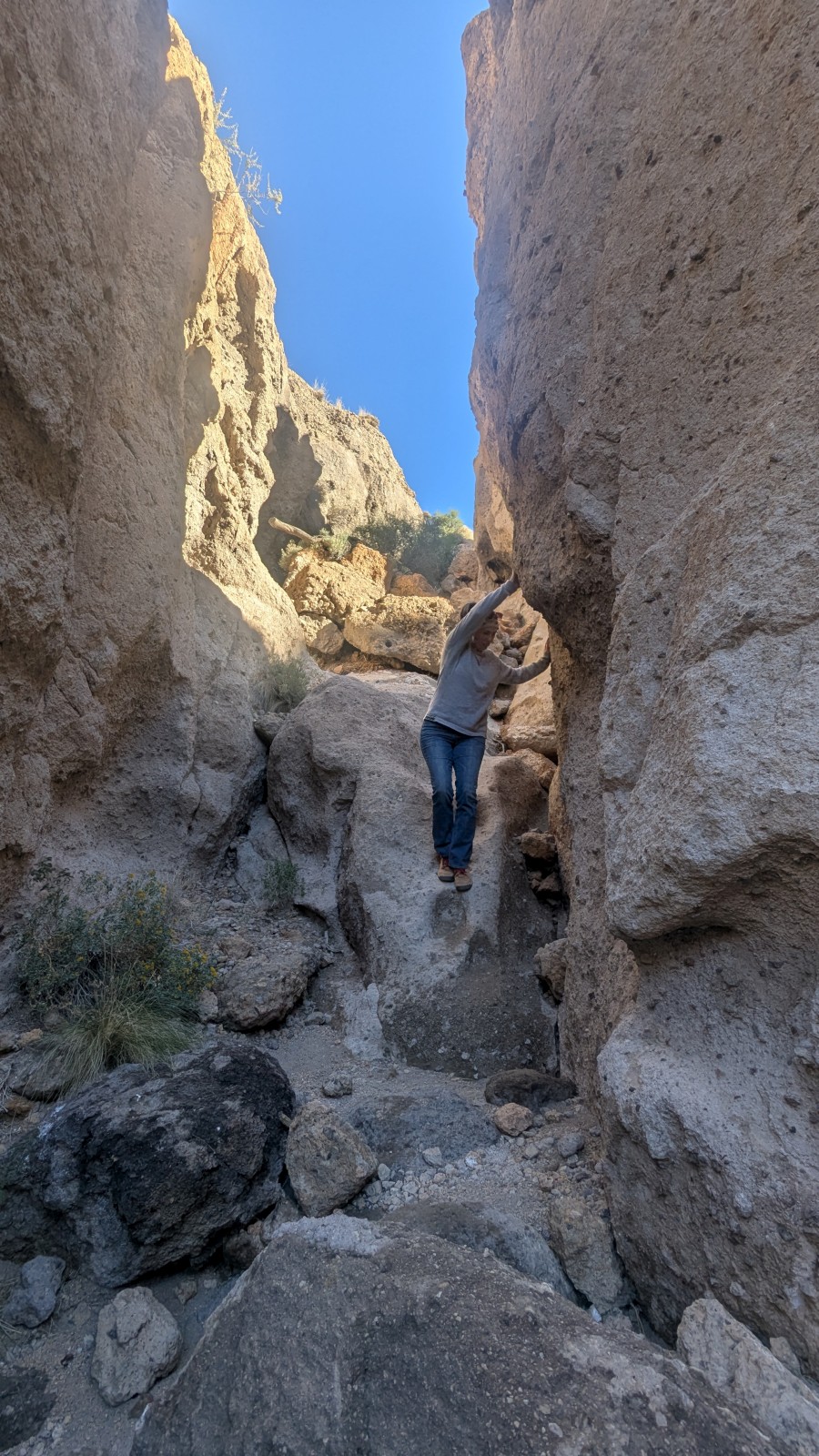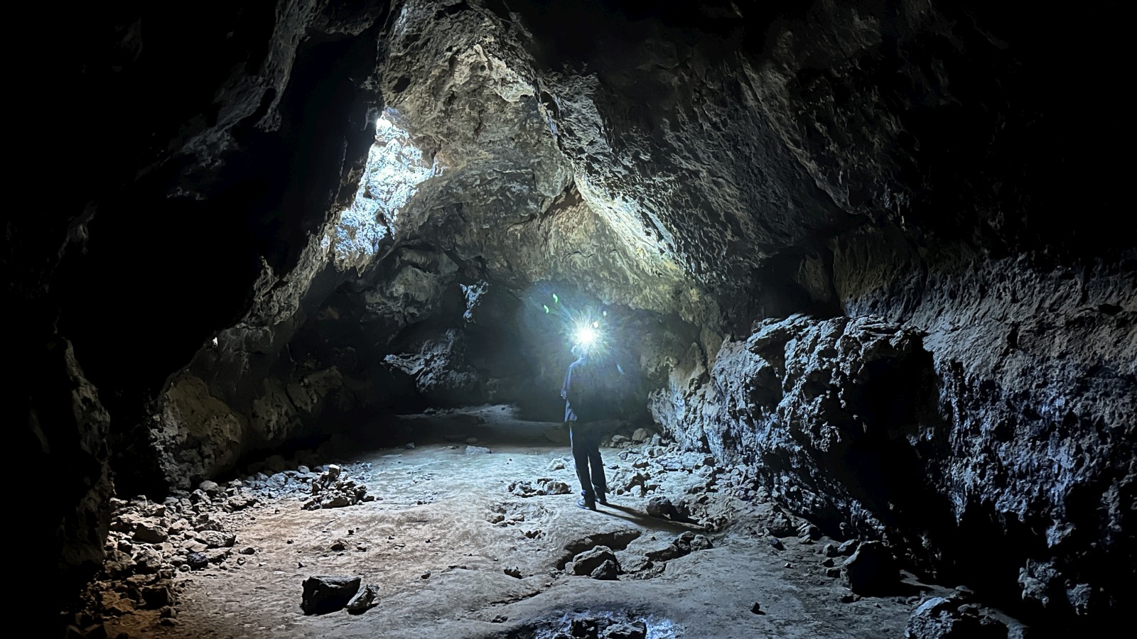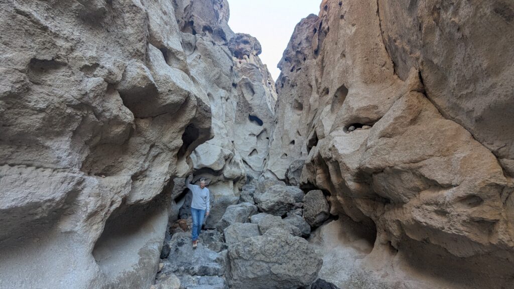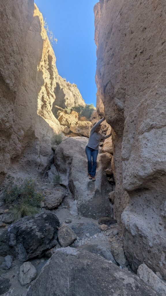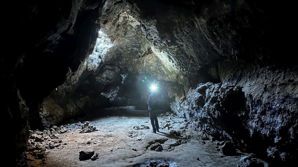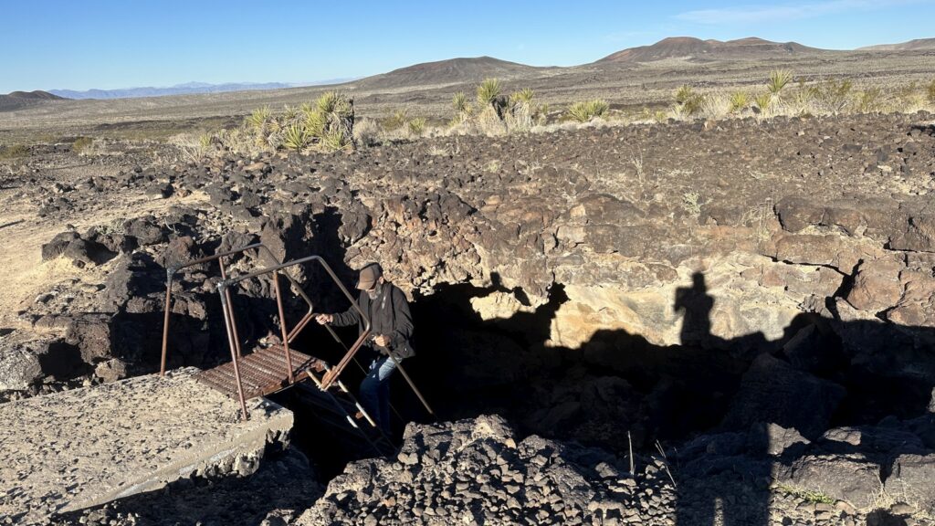 One last Mojave stop remained: the volcanic area on the west side of the preserve, home to a small lava tube. The road in came with the familiar high clearance / 4WD warning, but turned out to be mostly bumpy rather than difficult. We parked near the tube and stayed the night. The next morning we explored the lava tube. It wasn’t huge—maybe fifteen minutes is all it took—but it was still worth the detour.