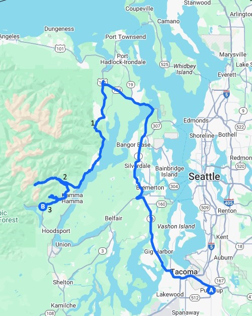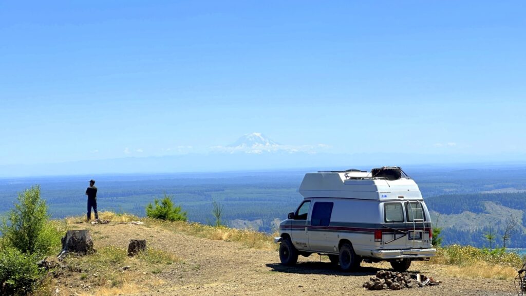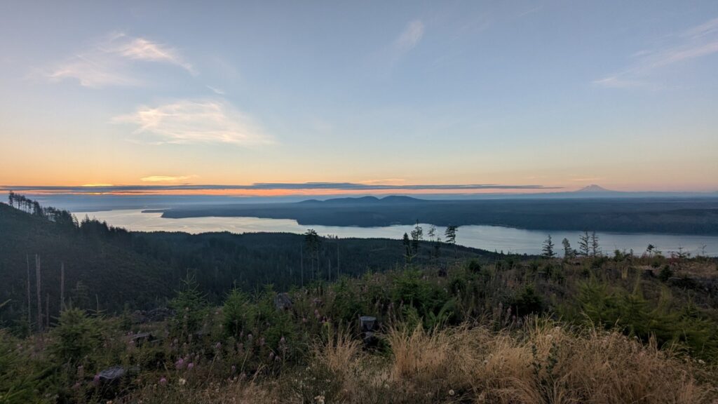 After 3 nights alone atop a mountain we were finally [partially] decompressed, from being around so many people for the past two months, to try that spot Kerri had first pinned. It wasn’t far down the road at all, and I was keen to do more dirt roads in Marcel. So, down the mountain we went. Marcel getting another massage from the trees and bushes as we dropped in elevation. Then to a neighboring dirt road where we began the climb back up another mountain. A large open area (2) awaited us on this mountain too. One which the satellite view made it clear we would have an unobstructed Starlink connection this time around. And those morning nature calls came with the massive view of Mount Rainer on the horizon and Hood Canal below. Who could ask for more?