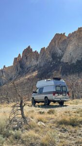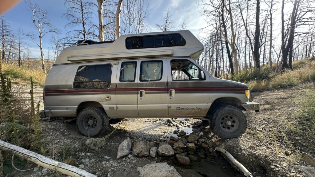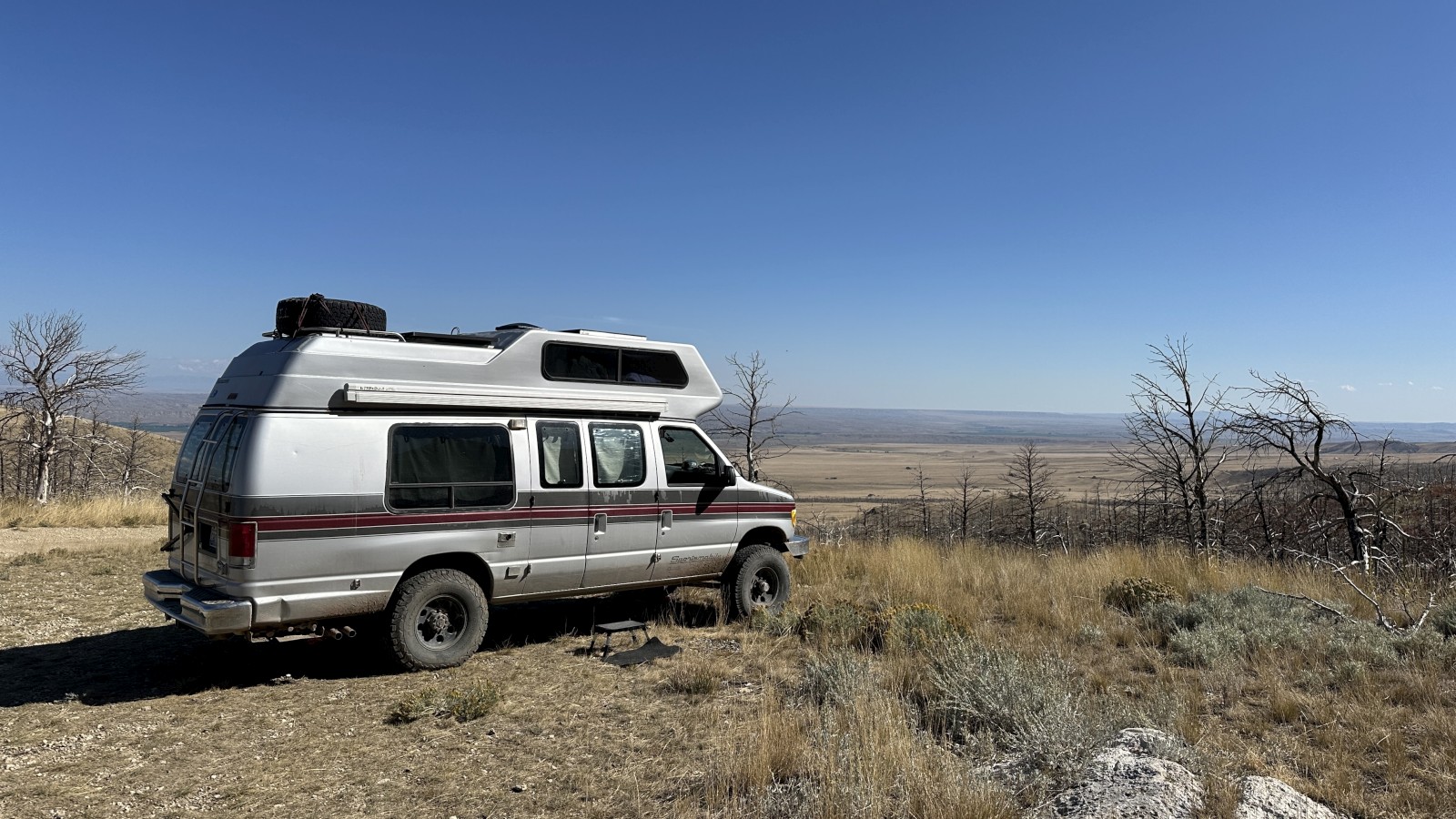 We considered the usual fixes — rocks, ramps, momentum, prayers — but the math didn’t add up. Getting stuck out here would’ve been a long, embarrassing story to tell a tow truck driver. For the second time in our short history with Marcel, a sharp incline had beaten us. So we did what any self-respecting travelers do: turned around, retraced every mile of ruts we’d just conquered, rolled back to the ranger station, crossed over Bear Creek Pass, and dropped south into Wyoming — dusty and, humbled.