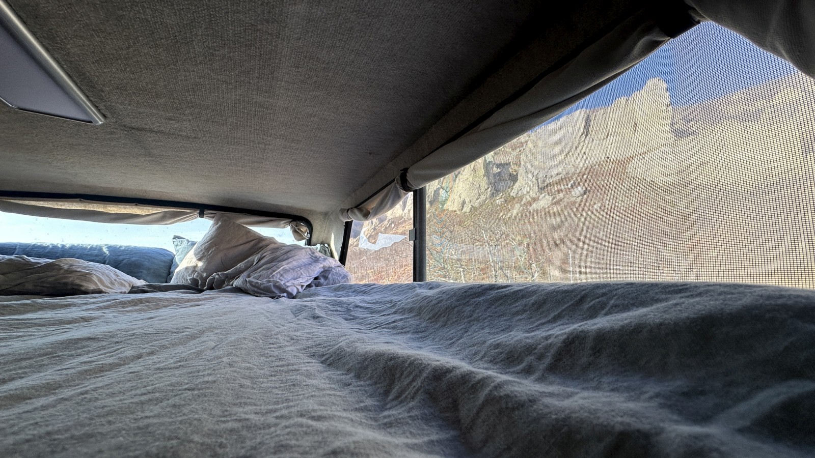 Within minutes, we were crawling at a snail’s pace, Marcel’s tires riding the canyon-like grooves carved by braver (or dumber) travelers before us. It was slow, bone-rattling progress, but somehow satisfying. About five miles in, we found a small rise with a rocky ridge behind it, leveled Marcel as best we could, and called it home for the night. The view was pure Montana — wide, silent, and painted in gold and gray.