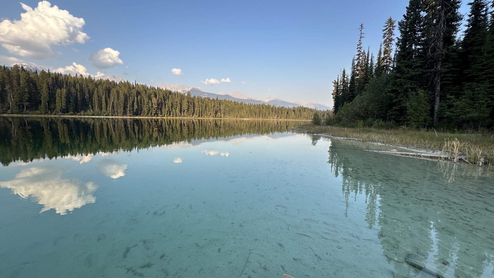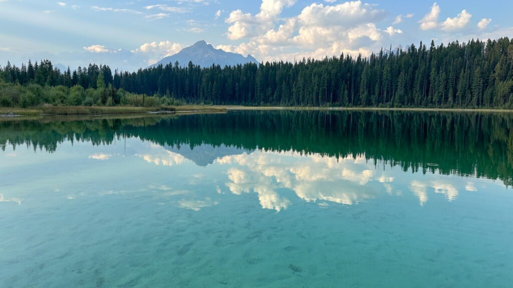 Marion Lake. The place was perfect. Free, quiet, and somehow all ours. Just down the road, an earthen boat launch tempted us, but signs said no camping, so we respected it. The lake shimmered like liquid sapphire — honestly the bluest water we’d seen in all of Canada. It was so clear it felt like peering through the sky itself. Tiny fish darted around our feet, eating mosquitoes we swatted and dropped on the surface. For the first time in my life, I found myself wishing for more mosquitoes.