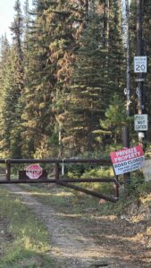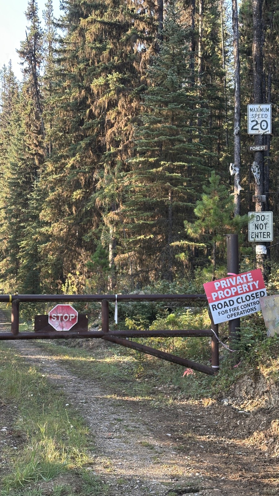 The next morning we hit the road again, winding south past Kootenay Crossing and Paul Creek Rec Sites. Lake after lake blurred by — I swear we’d hit the hundredth when it happened. A gate. Not your average “please don’t enter” gate either — this one came with an entire mood: PRIVATE PROPERTY. VIDEO SURVEILLANCE. TRESPASSERS WILL BE PROSECUTED. And to really drive it home, a few bleached animal skulls hanging nearby.